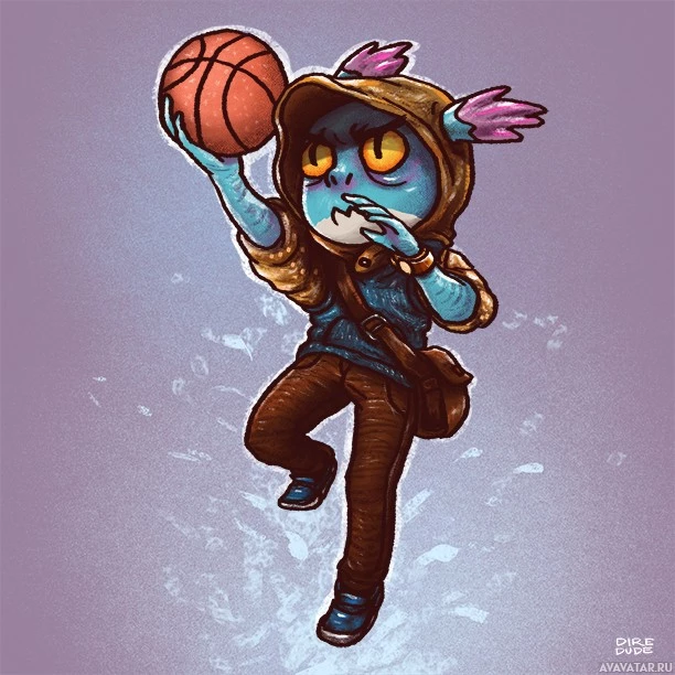 The image features an illustration of a character from the game Dota 2, specifically Slark. He is holding a basketball and appears to be dribbling it with both hands as if playing or preparing to play. The character has a distinctive appearance with