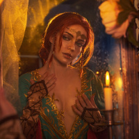 a red cloak and has her hair styled differently than her typical appearance. The setting suggests that this might be a moment from the game's storyline where Triss is reflecting upon a particular situation or preparing for