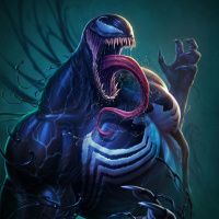 sharp teeth that are not typical of the traditional depiction of Venom. The background is dark, which accentuates the character's