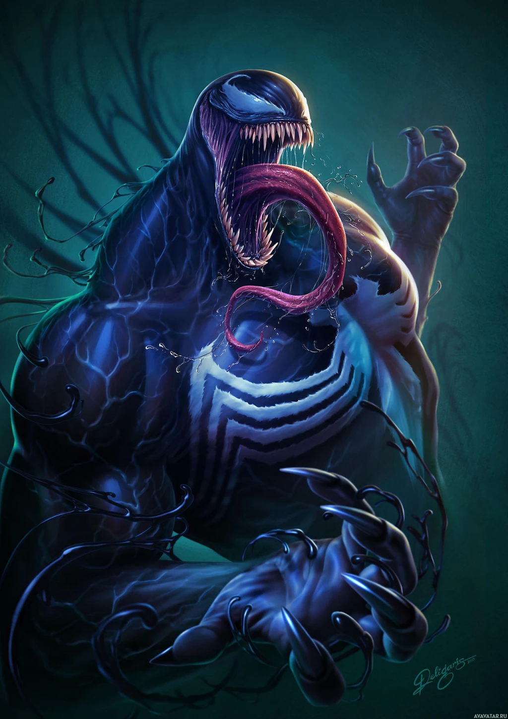rendition of the character known as Venom. This version of the character appears more menacing and dark, with an exaggerated expression on its face and additional elements like darker shades and