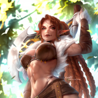 an outdoor setting with greenery and sunlight filtering through the leaves. This image has been labeled as fantasy, elf, and red-haired, indicating the genre of the character's depiction and the color of her hair.
