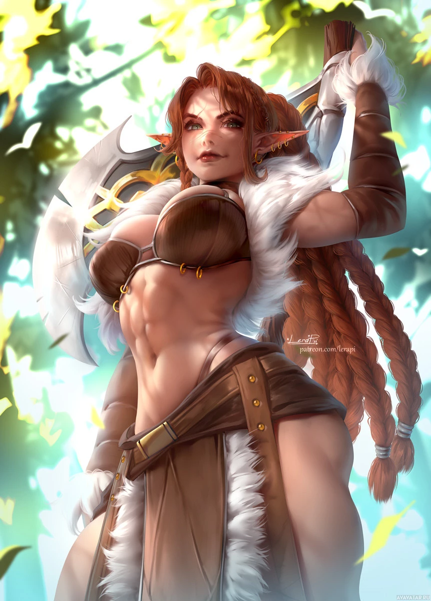 a fantasy outfit consisting of a leather bodice, fur trim, a sword on her waist, and what appears to be a shield strapped to her arm. The background suggests