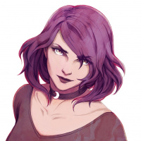 The image shows an illustration of a woman with purple hair. She has a stern or intense expression on her face and is wearing a dark-colored top. The background is plain, which helps to focus attention on the character's features.