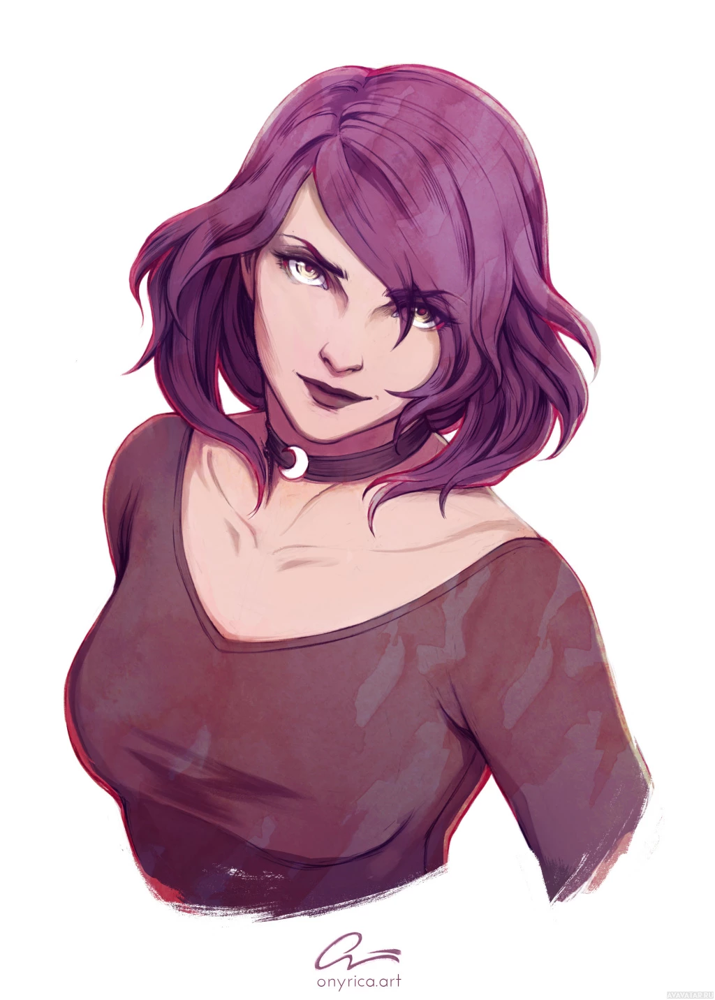На картинке изображена женщина с фиолетовыми волосами. У нее строгое или напряженное выражение лица, и она одета в темный топ. Фон простой, что помогает акцентировать внимание на чертах персонажа.