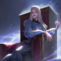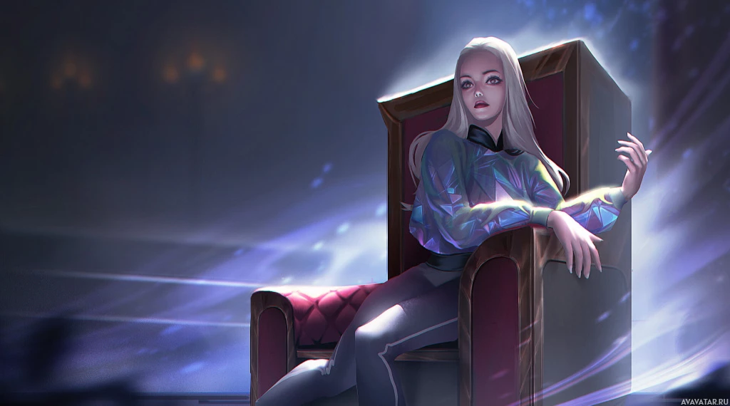 На картинке изображен созданный в цифровом формате персонаж женского пола с белыми волосами. Она восседает на чем-то вроде трона или высокого стула, что придает ей вид авторитета или важности. Фон предполагает магическую или мистическую обстановку, возможно, указывающую на то, что персонаж обладает какими-то сверхъестественными способностями или статусом.