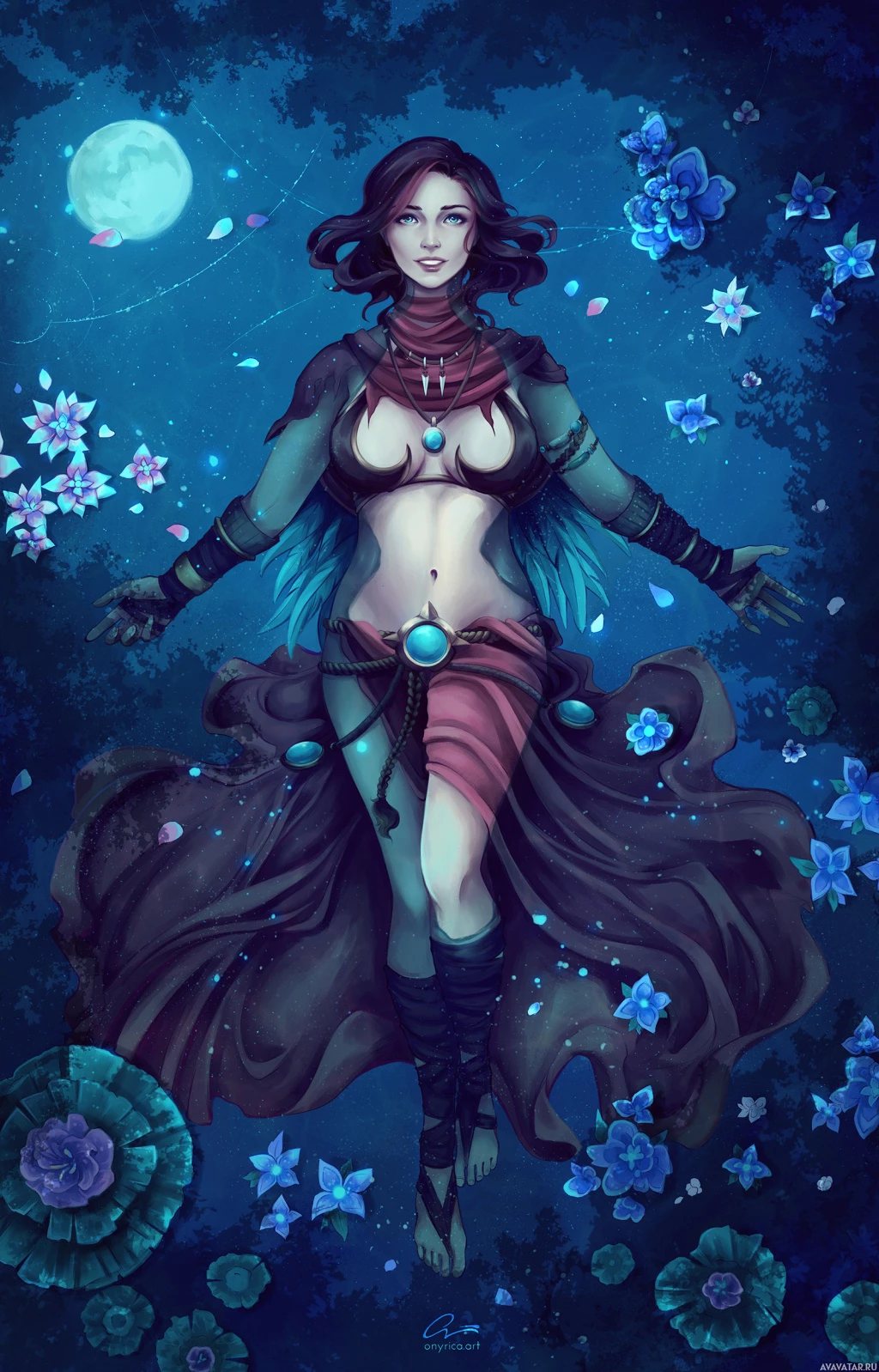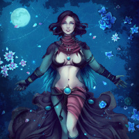 hints of blue and green, creating a mystical or underwater atmosphere. There are also elements like flowers and what appears to be a moon, contributing to