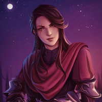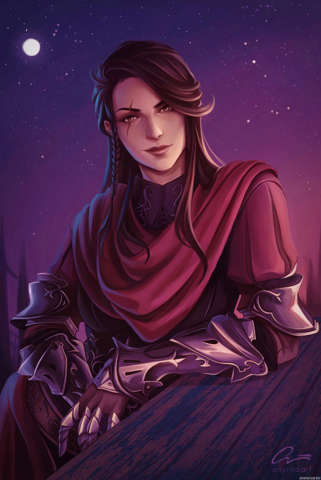 protective gear on her left arm, suggesting she might be a warrior or guardian of some sort. The background is dark with star-like patterns, giving it