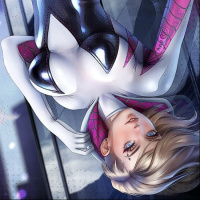 Gwen Stacy, a popular comic book character from the Marvel universe. She is depicted in her Spider-Gwen costume, which includes a spider emblem on her chest and