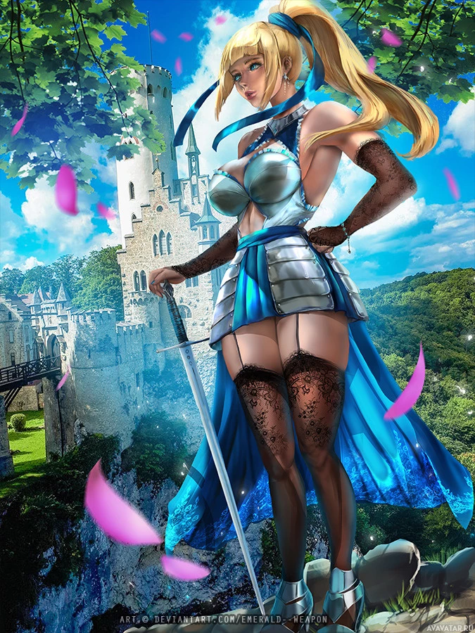 blonde hair and wearing a sword. She is dressed in what looks like fantasy or