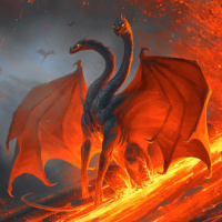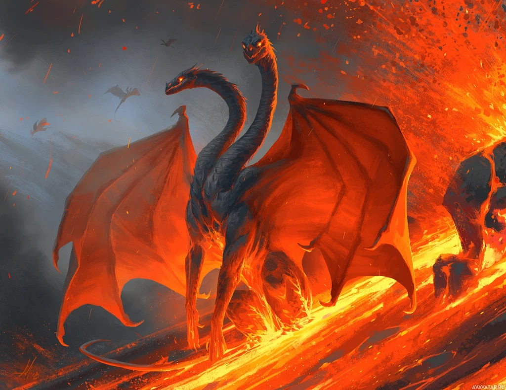a fantastical scene featuring a dragon-like creature amidst an erupting volcano. The dragon is depicted in mid-flight, with its wings spread wide and scales glowing red, indicating the intense heat or fire element associated with it. Surrounding the dragon are