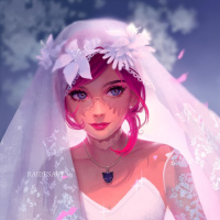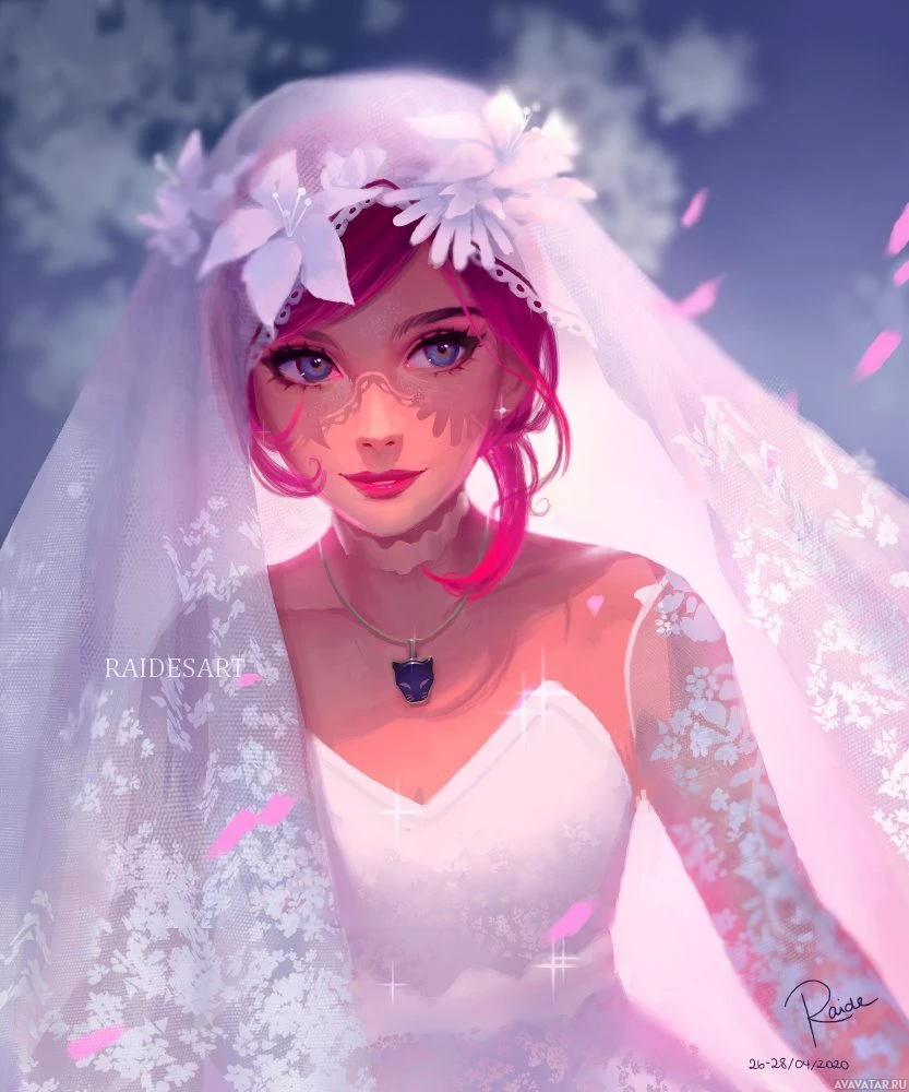an animated character with pink hair, wearing a white veil and what appears to be a wedding dress. She has