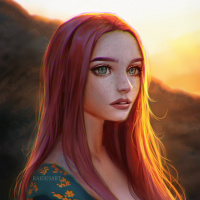 a serene expression, with her gaze directed off to the side, and she appears to be looking at something or someone that is not visible in the frame. Her hair color gives her a distinctive appearance, and she wears what seems to be
