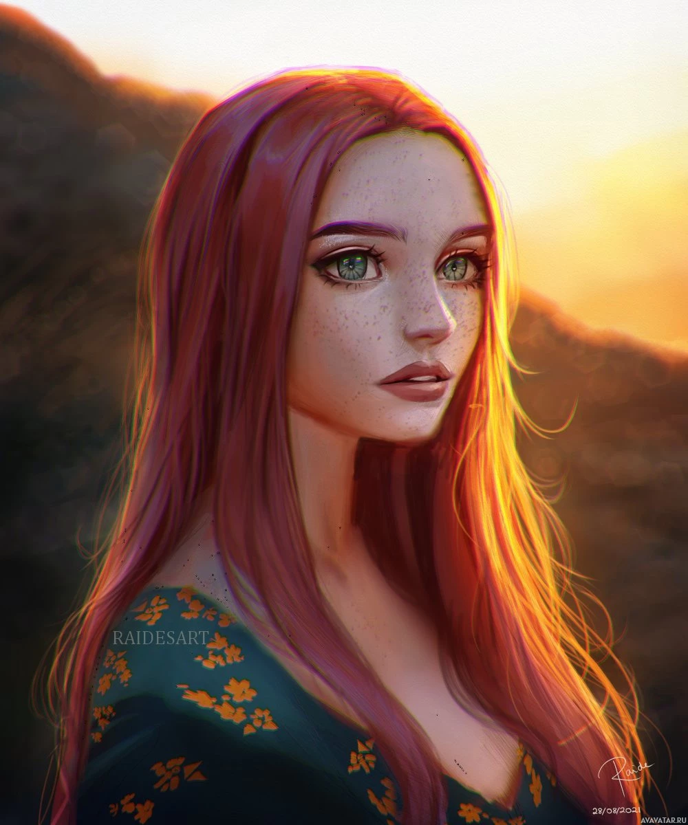 a dark top with floral patterns. The background suggests an evening setting, possibly during sunset, given