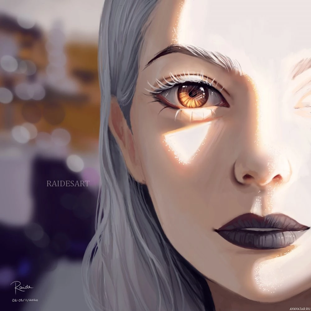 long hair, is wearing lipstick, and her expression appears contemplative or focused. In the background, there's an out-of-focus cityscape that suggests