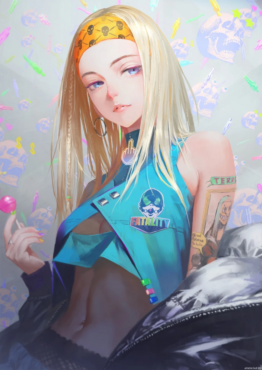 a white top with a graphic or logo on it. The character has tattoos on her arms and neck, including one that reads "F". She's holding what appears to be a candy in her hand. The background includes a colorful pattern that could suggest