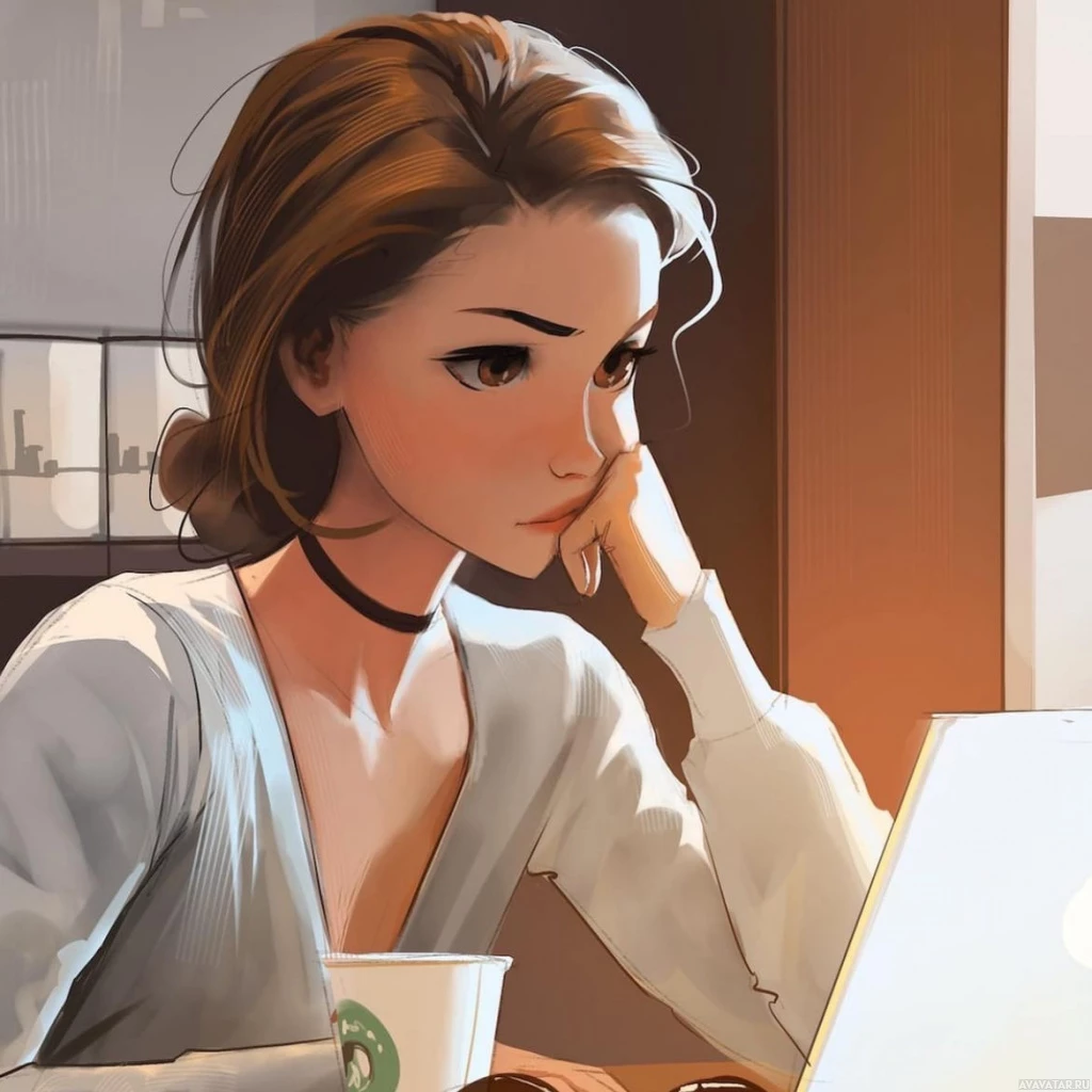 a coffee cup with a logo on it, which suggests she might be at a cafe or using a branded mug. The setting appears to be