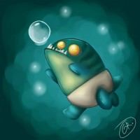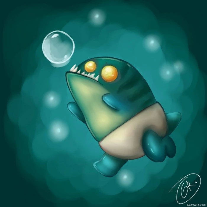 large eyes and tentacles, swimming in underwater surroundings. The character has