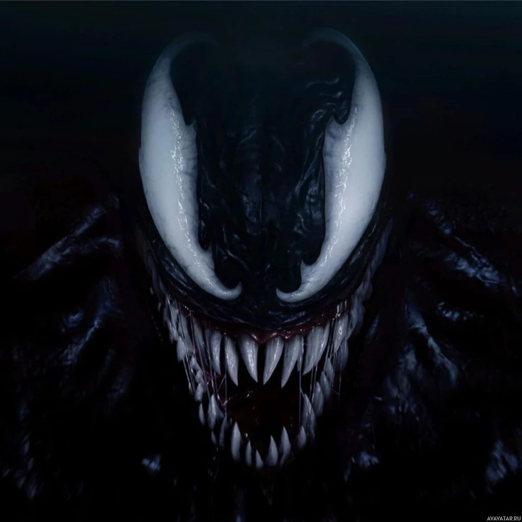 На картинке изображен персонаж Веном, вымышленный суперзлодей из комиксов издательства Marvel Comics. Он отличается внешностью инопланетного симбиота и знаковой эмблемой белого паука на груди.