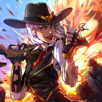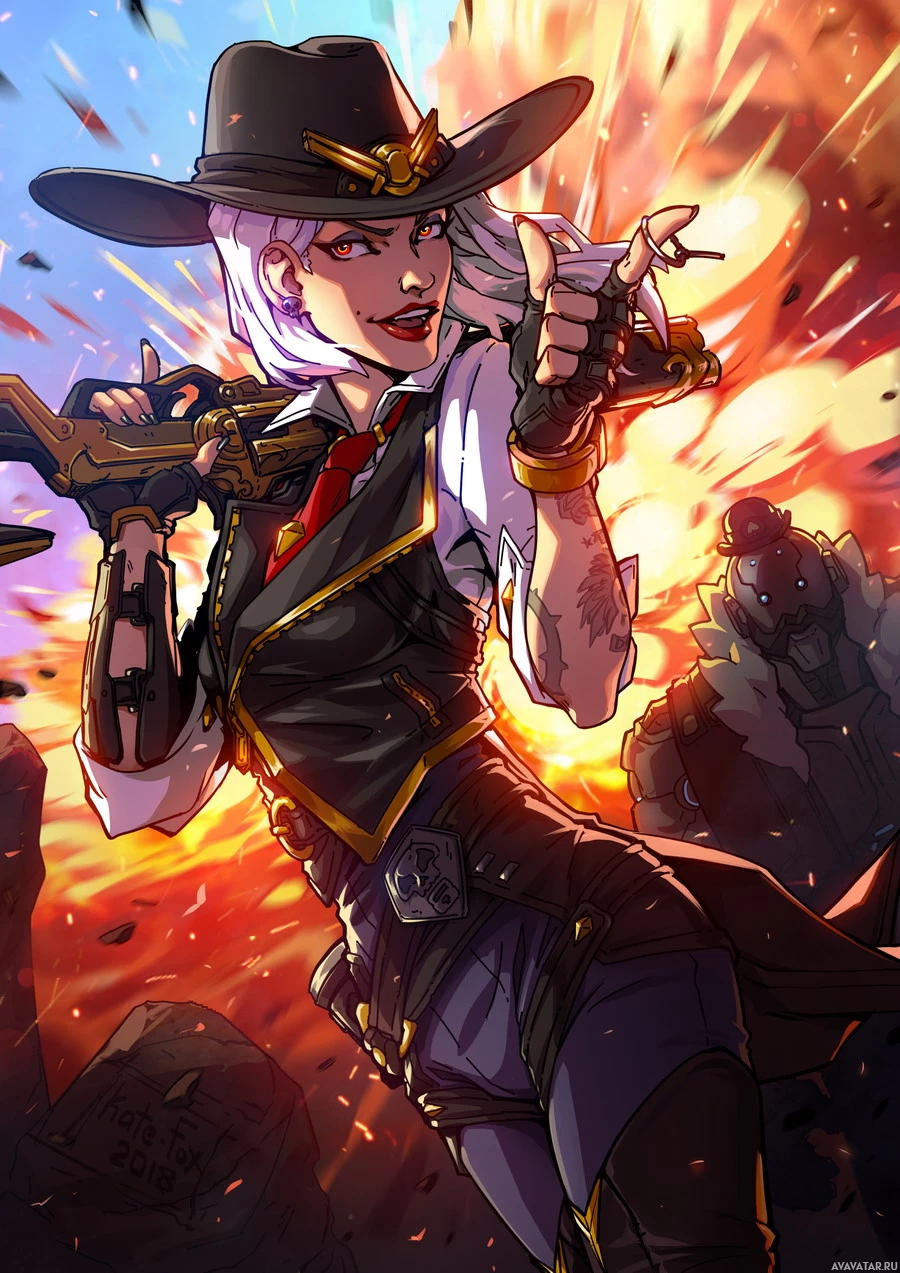 the video game "Overwatch." She is depicted with a confident and determined expression, holding a rifle in her left hand. In her right hand, she has