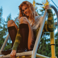 a young woman sitting on what appears to be a yellow swing or playground equipment. She has her legs crossed and seems to be in