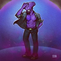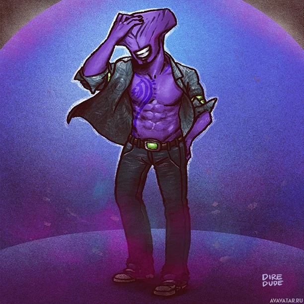 an animated character that appears to be Faceless Void from the game Dota 2. He is standing with one hand on his head, as if he's scratching or holding his hair in frustration or disbelief. His other hand is tucked into his pocket, and his expression seems to convey a sense of annoyance or exasperation. The background has a purple hue, which matches the color scheme often associated with