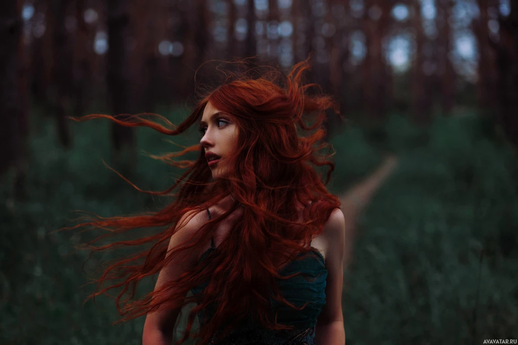 red hair in a windswept manner. They are positioned outdoors, surrounded by what appears to be forest or woodland, possibly during the late afternoon or evening, given