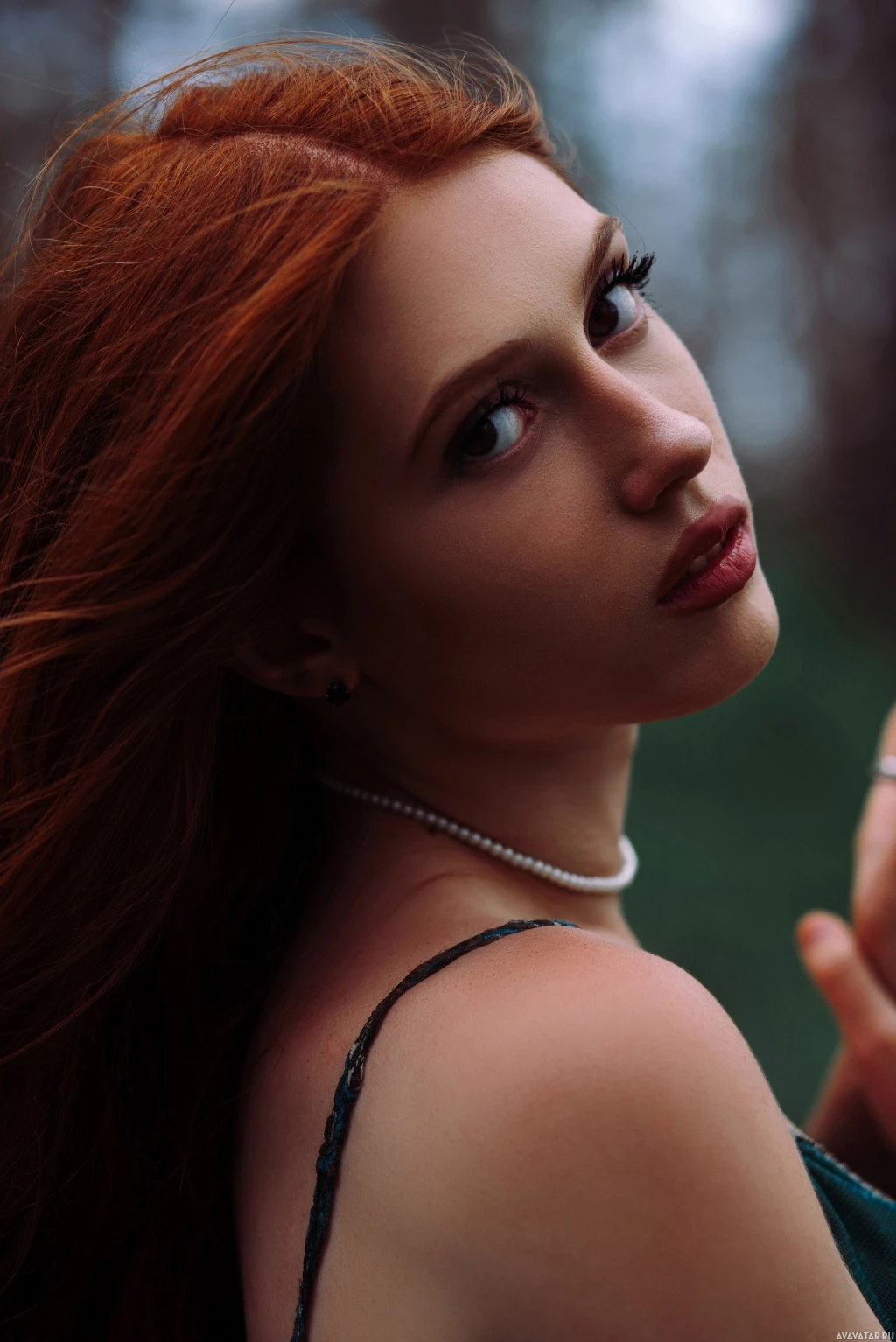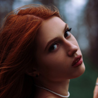 На картинке изображена женщина с рыжими волосами. Она смотрит налево, на ее лице нейтральное выражение. Ее волосы кажутся мягкими и пышными, что наводит на мысль о том, что, возможно, было ветрено или она только что вошла в помещение после того, как побыла на улице на ветру.
