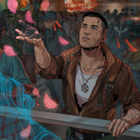 a male character in the center who appears to be interacting with a digital projection or augmented reality display. He's reaching out towards what looks like a floating, transparent figure that has red and blue highlights around it, suggesting a technologically
