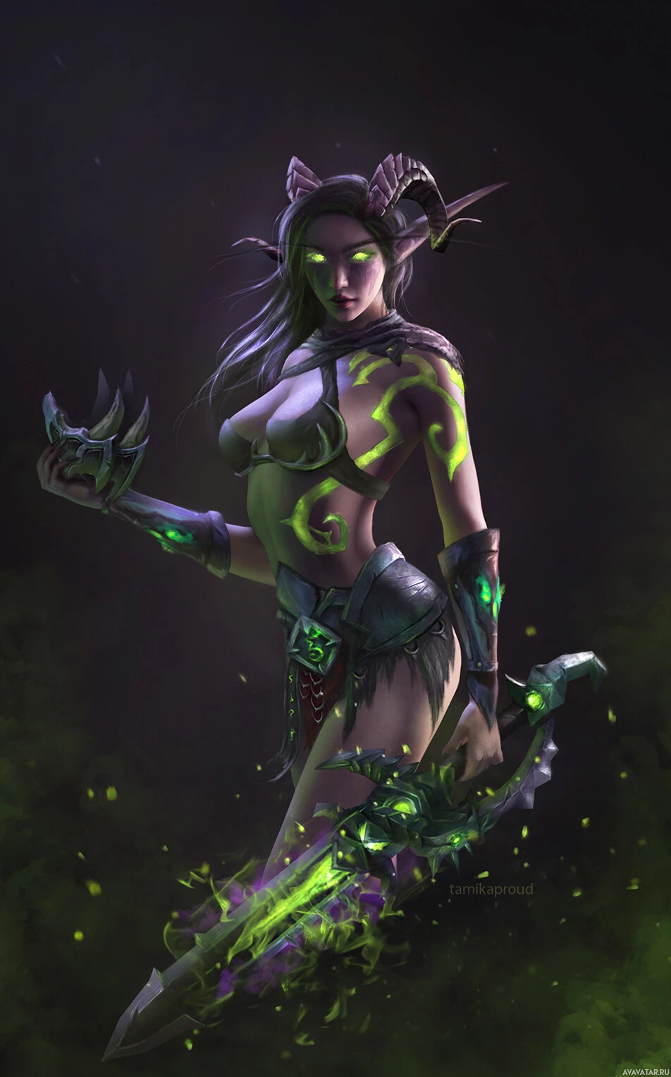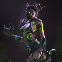 green skin, horns, and armor with a fantasy-inspired design, suggesting she might be a demon or a powerful creature within the game's universe. The background has a dark, smoky appearance with