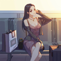 personal items around her, including what looks like a handbag and a camera bag, which might indicate that she is either coming from or going to some sort of photography activity. The background suggests an outdoor