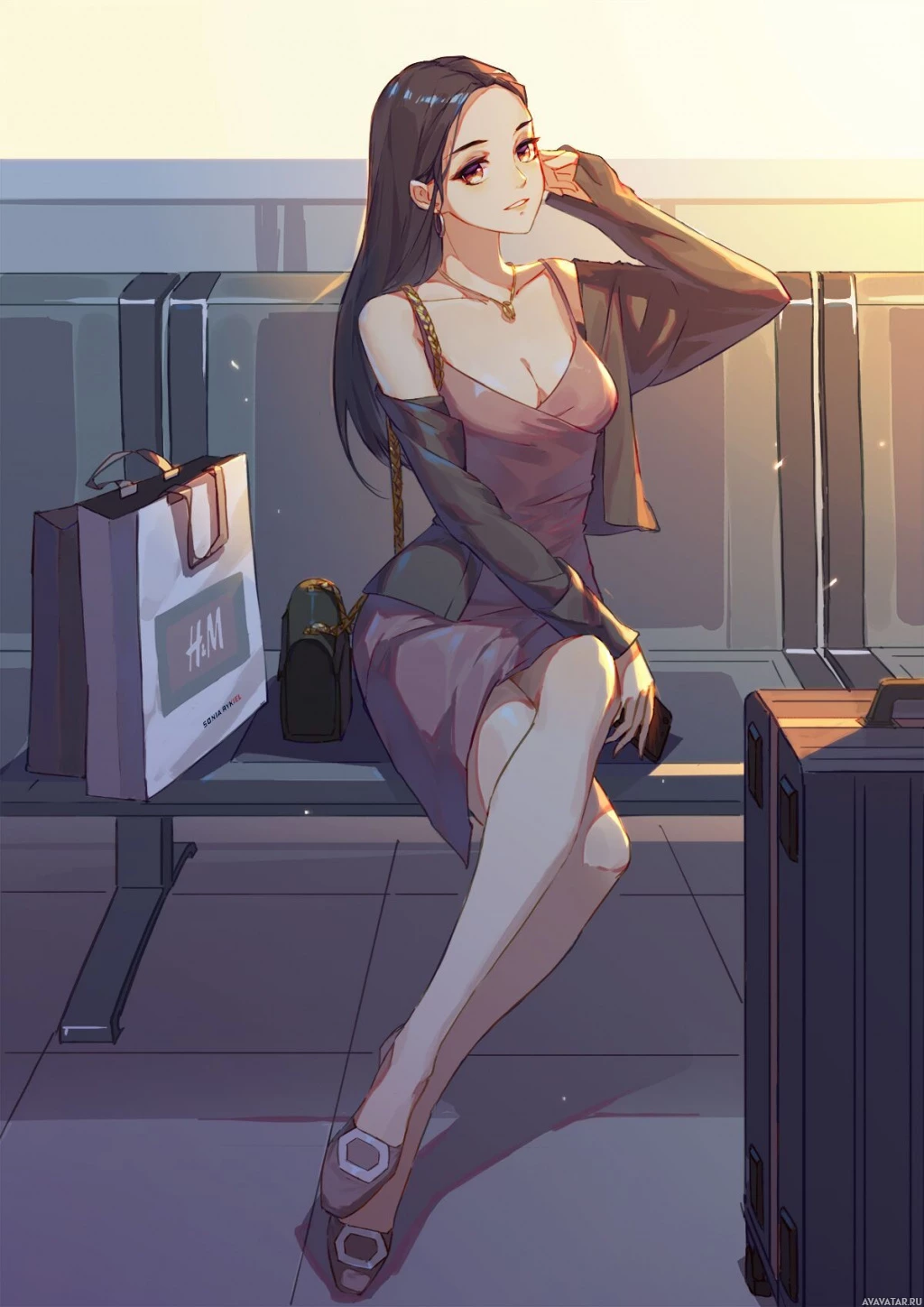 dark hair and is wearing a sleeveless dress that appears to be pink or light purple in color, paired with high heels. Her posture suggests she's casually posing for the picture, possibly during sunset given