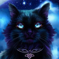 crescent moon is hanging in the sky, and there are also stars scattered around. The cat wears a small circular pendant with