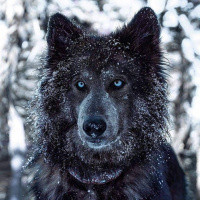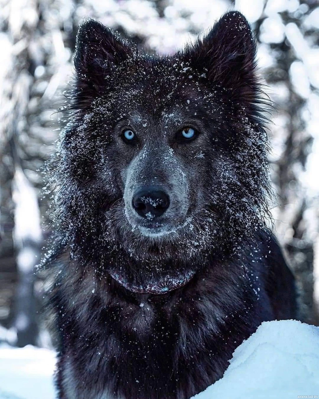 The image depicts a wolf with its fur covered in snow. It appears to be standing in