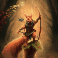 a whimsical scene where an anthropomorphic squirrel is portrayed in a human-like pose, sitting cross-legged on a branch. The squirrel is holding a bow and arrow, which it uses for hunting or archery. It appears to be wearing armor, suggesting