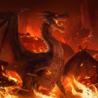 a fantasy scene with a large dragon in the center. The dragon is shown with its wings spread wide and is standing on what appears to be molten lava or fire, suggesting