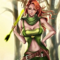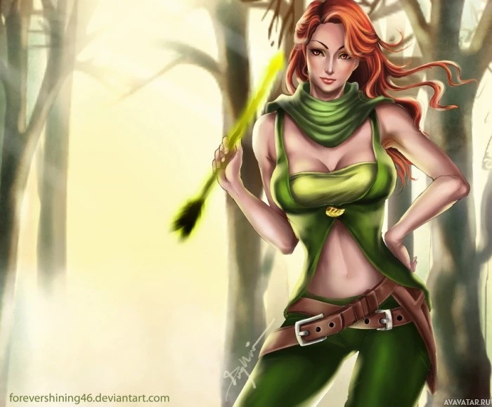 На картинке изображен иллюстрированный персонаж, напоминающий Виндрейнджера из игры «Дота 2». Показано, что она держит лук, одетая в зеленый наряд с плащом и доспехами. Волосы у нее красные, и на лице у нее решительное выражение, как будто она готова к действию или нацеливается на что-то не видное в кадре.