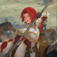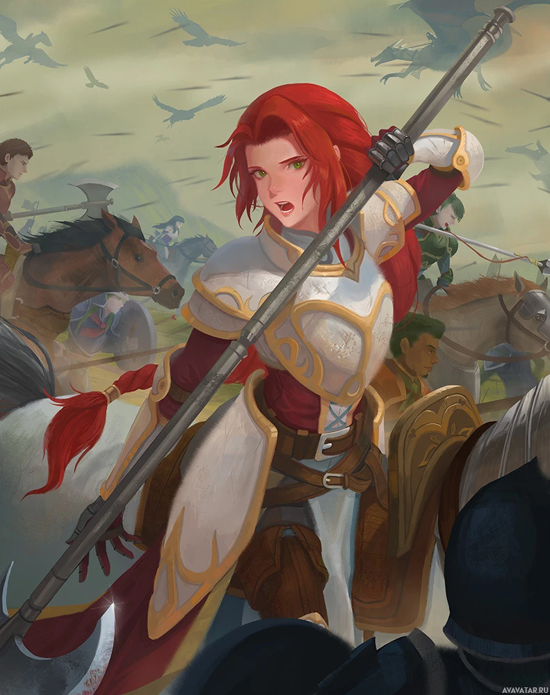 На картинке изображена рыжеволосая девушка со свирепым выражением лица, одетая в доспехи и вооруженная мечом. Кажется, что она скачет верхом на лошади посреди сцены битвы в окружении других воинов. Вероятно, она изображена как храбрый и умелый воин в контексте фантастического или исторического сюжета.