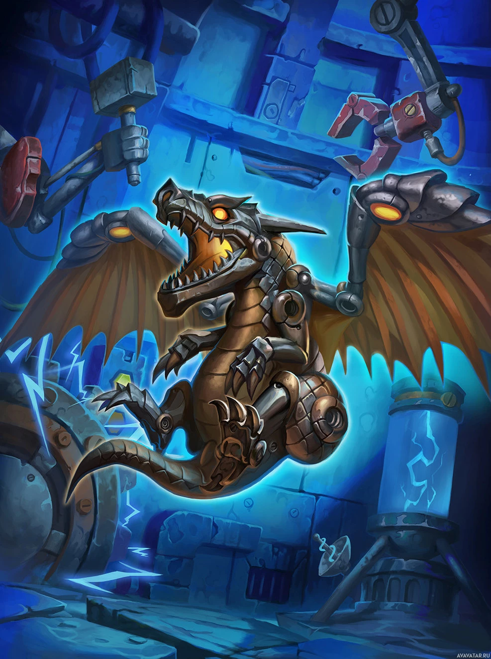 The image depicts a fantasy-themed illustration featuring a dragon. The dragon has both reptilian and mechanical characteristics; it has the body of a dragon, complete with wings and scales, but also features such as gears, wires, and mechanical parts attached to its body, suggesting some sort of