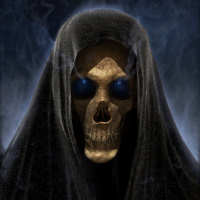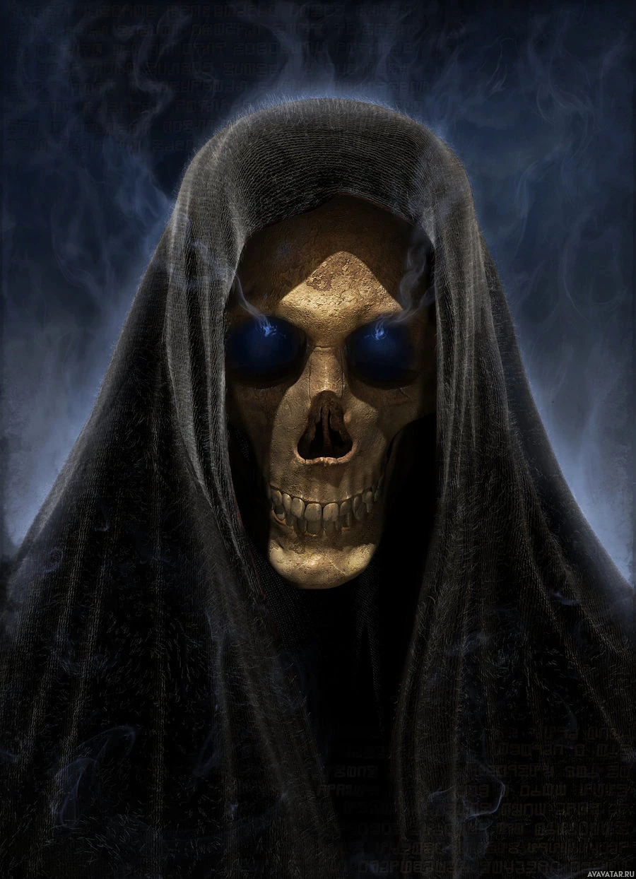 a hooded cloak, which is often used as a symbol of mortality and mystery in various cultural narratives. The overall tone of the picture seems dark and ominous, fitting with the theme of death.