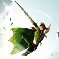 The image shows a character from the game "Dota 2," known as Windranger. This character is depicted in mid-motion, possibly casting an arrow or shooting a bow, set against a forest backdrop. The style of the artwork suggests it might be promotional material for the game.