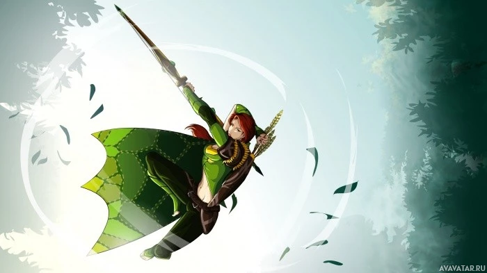 На картинке изображен персонаж из игры «Dota 2», известный как Виндрангер. Этот персонаж изображен в середине движения, возможно, бросая стрелу или стреляя из лука, на фоне леса. Стиль произведения предполагает, что это может быть рекламный материал для игры.