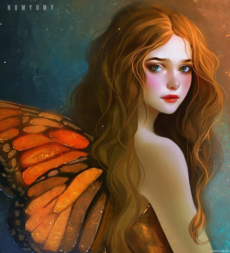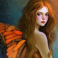 expressive eyes and is wearing what appears to be fairy wings. Her outfit and the way she's depicted give her a whimsical or fantastical look, as if she could be