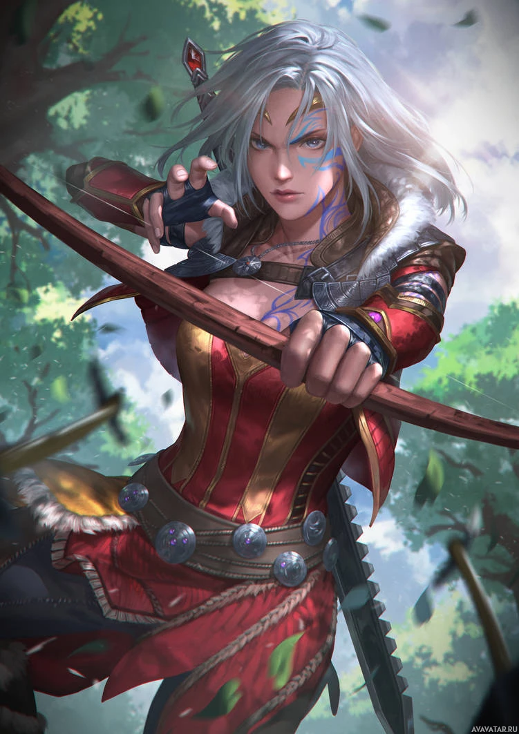 a female character with white hair, who appears to be from the video game or comic book "Overwatch." She is depicted as an archer, holding a bow and arrow in each hand. Her attire includes what looks like a fantasy-style outfit with red and gold elements, which suggests she might have