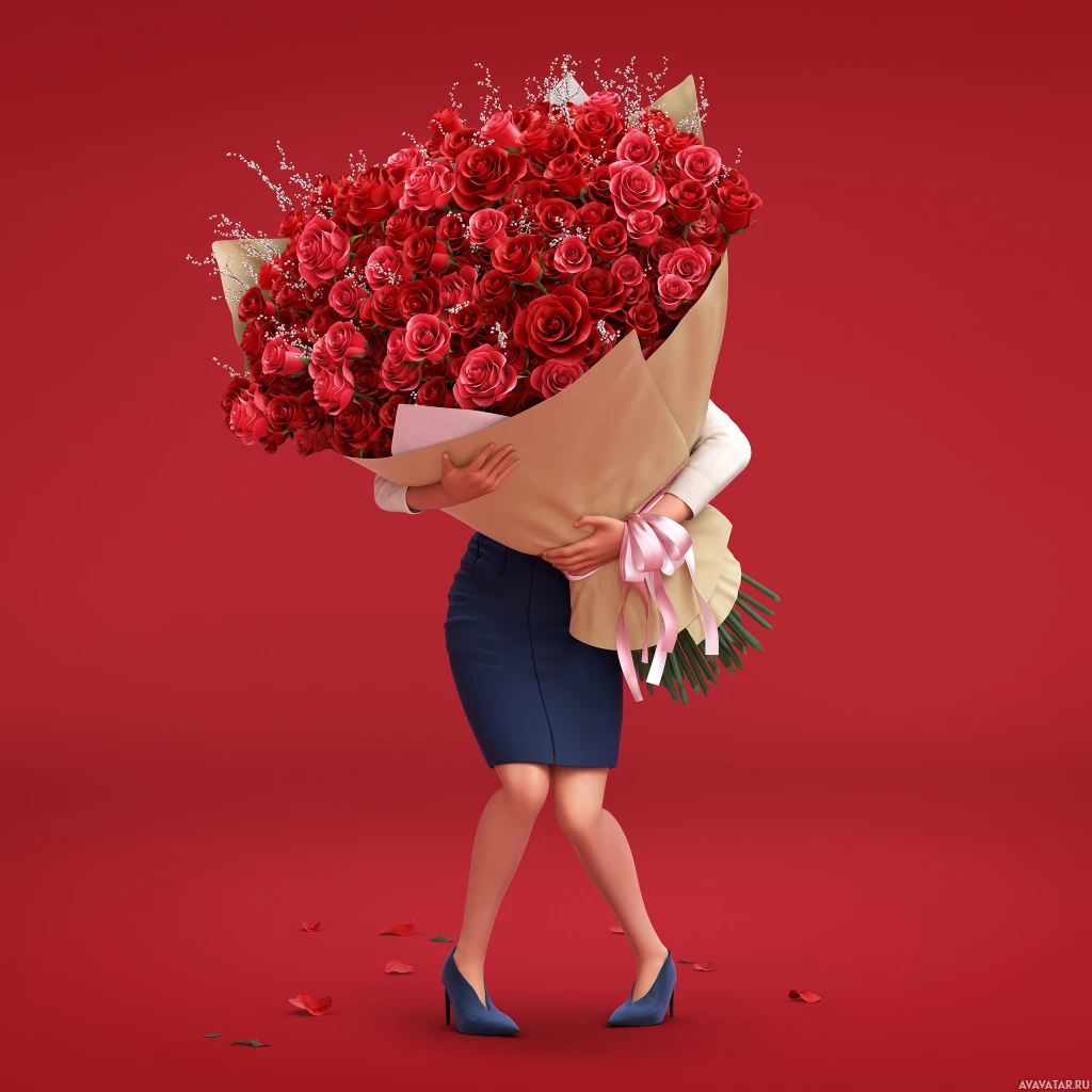 female character holding a large bouquet of red roses. She appears to be in motion, perhaps walking or dancing, with the roses spilling out from the bouquet she is carrying. The background is a plain