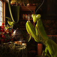 various objects, including books on shelves and decorative items such as flowers. A mantis is perched in the foreground, giving the impression that it is observing or looking into the room. The setting appears to be a cozy living area or study, with