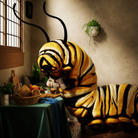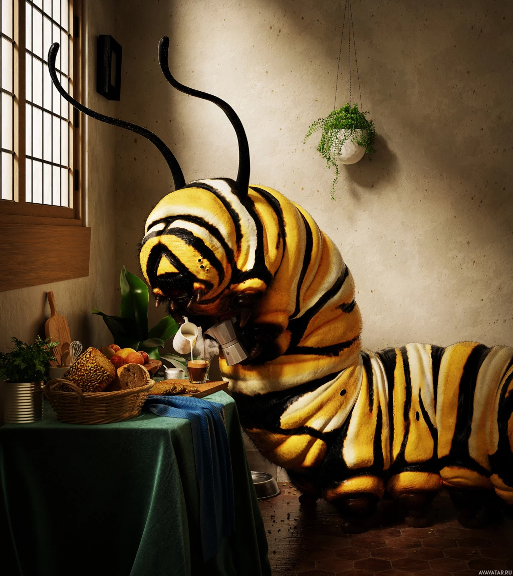 a whimsical scene with an anthropomorphized caterpillar, which is commonly known as a caterpillar. It has been artistically dressed up to resemble a person sitting at a table. There are various items on the table that suggest this might be