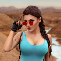 The image depicts a person dressed in costume, reminiscent of Lara Croft from the "Tomb Raider"