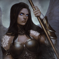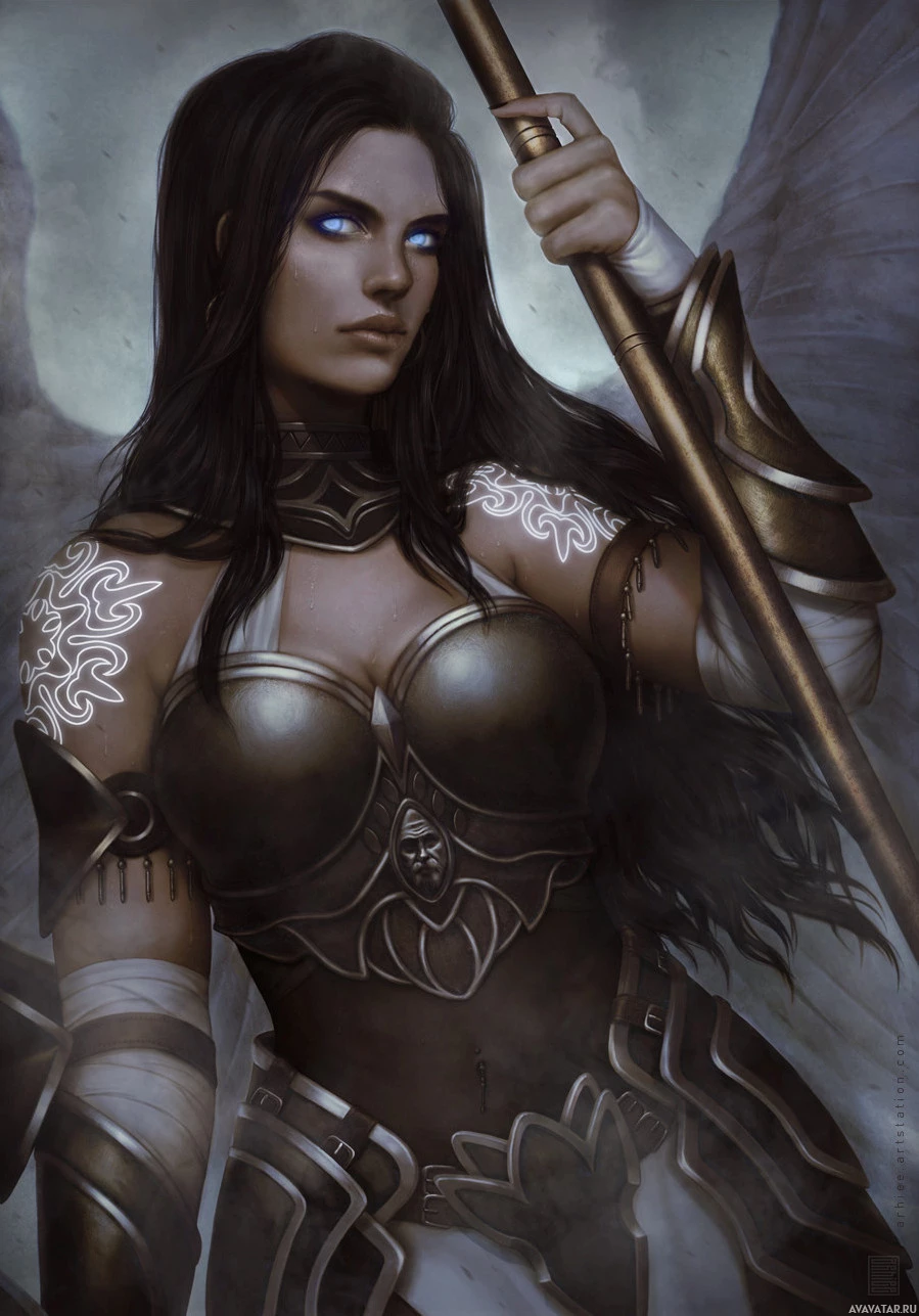 blue eyes, and is wearing what appears to be armor with intricate designs on her chest. In one hand, she holds a sword, while the other hand rests on it, suggesting readiness for battle or protection. The character is set against a somber backdrop that conveys