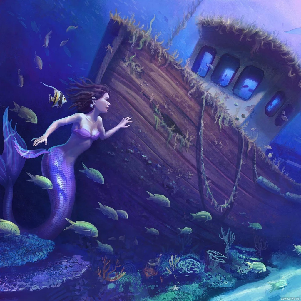 На картинке изображена фантастическая сцена с русалкой. Молодая женщина с длинными волосами, похожая на русалку с хвостом и чешуей, выходит из воды. Она плывет к старому деревянному кораблю, который, кажется, стоит на мели или якоре на дне океана. На борту корабля есть несколько иллюминаторов. Русалку окружают различные рыбы, создавая подводную атмосферу сцены.