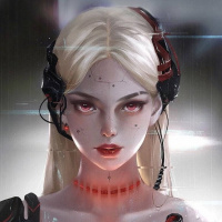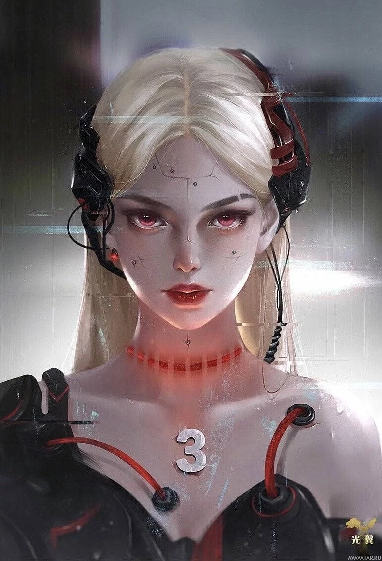 blonde hair and what appears to be a cybernetic or robotic interface. She has a number '3' visible on her chest area, suggesting she might be a part of a series or collection related to numbers. The background has digital or circuit-like patterns, enhancing